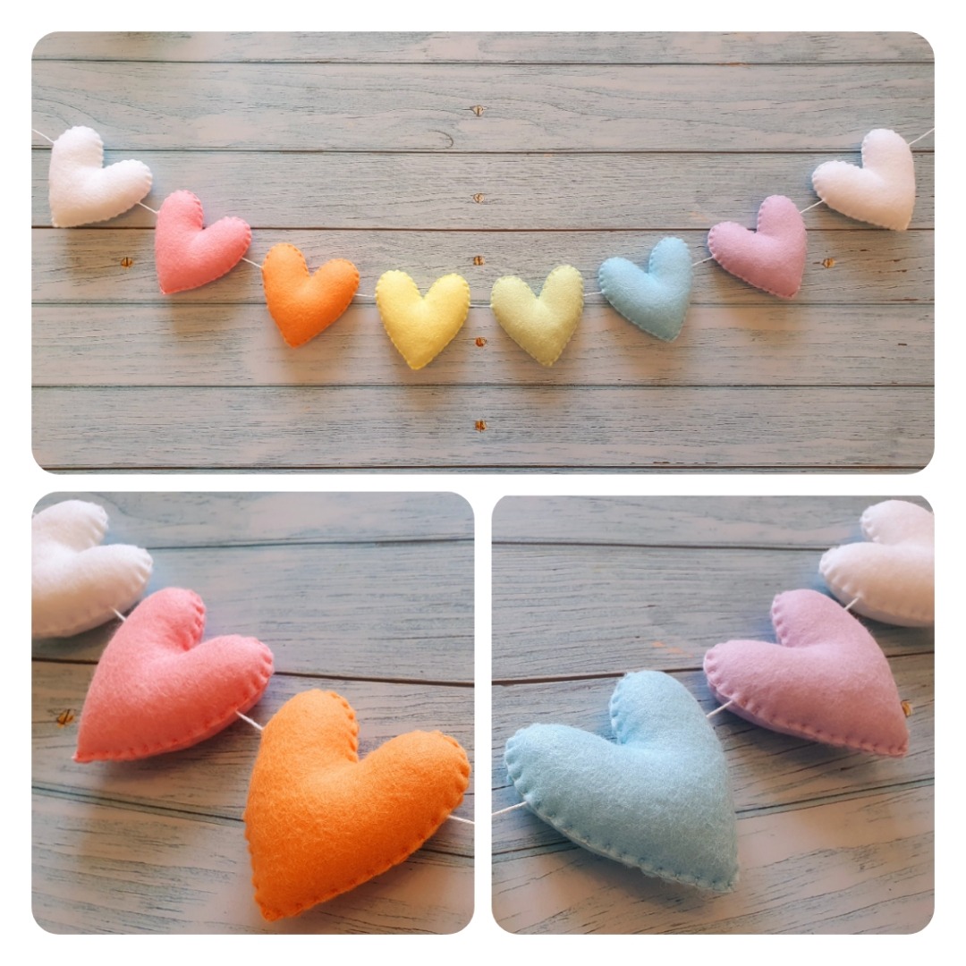 The garland features 8 different rainbow coloured felt hearts, each star is lovingly hand stitched.