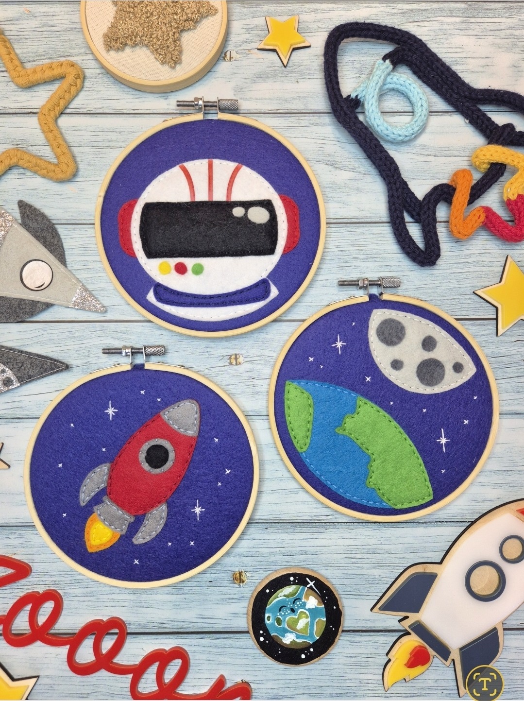 These beautiful space themed wooden embroidery hoop hanging decorations would add the perfect finishing touch to any space themed bedroom.