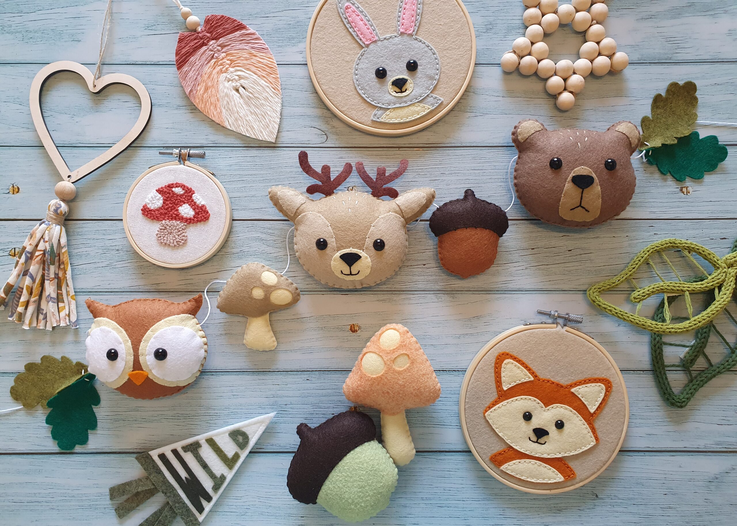 Each garland includes an owl, bear and deer as well as a small acorn and mushroom and leaves at either end.